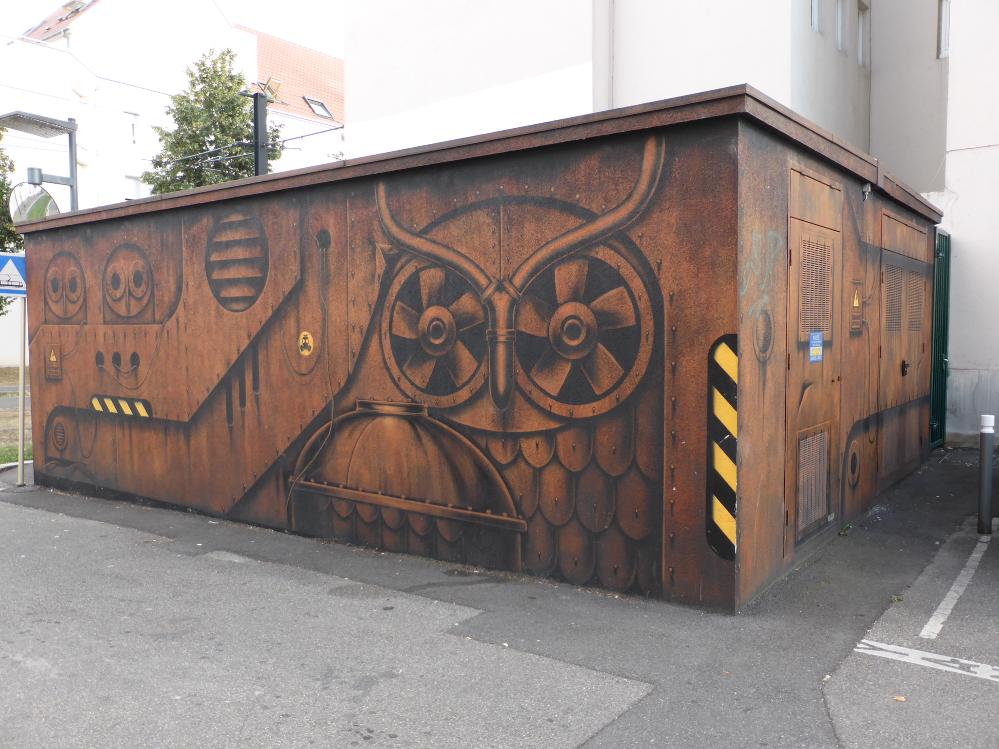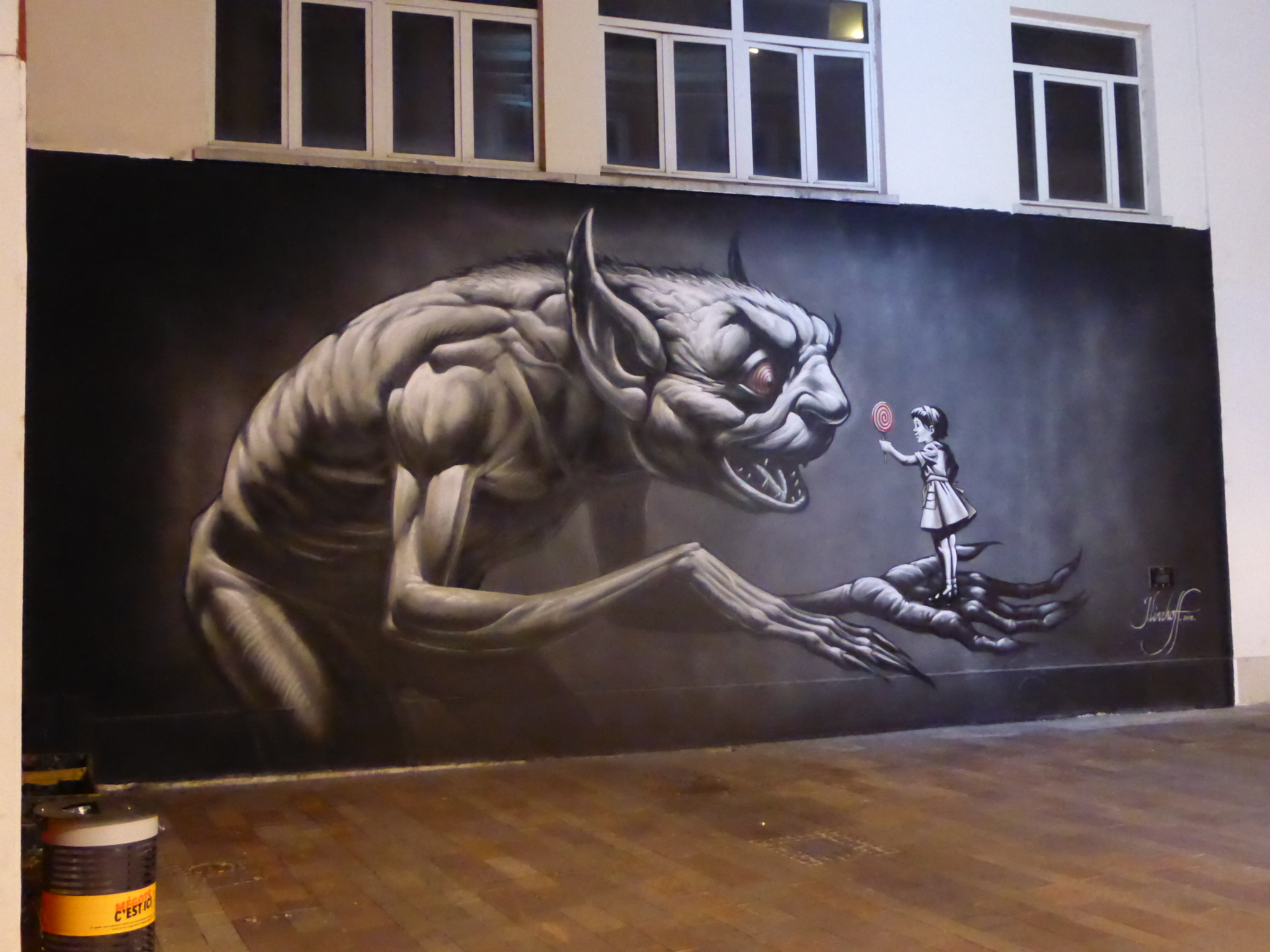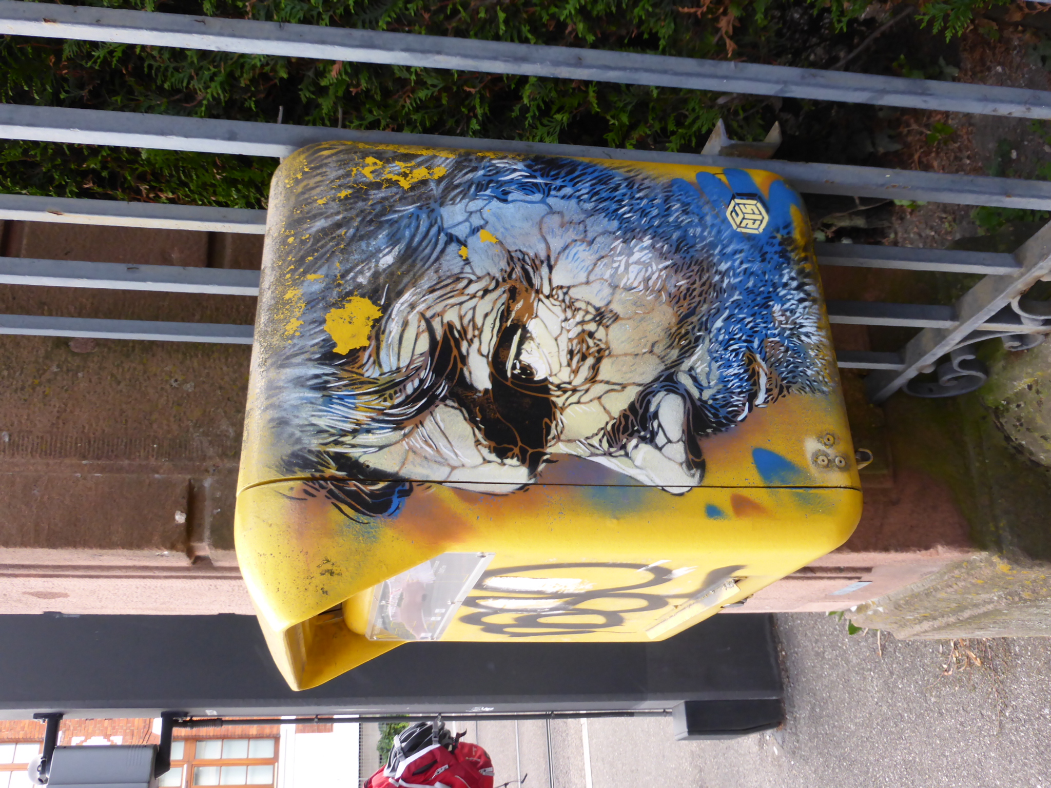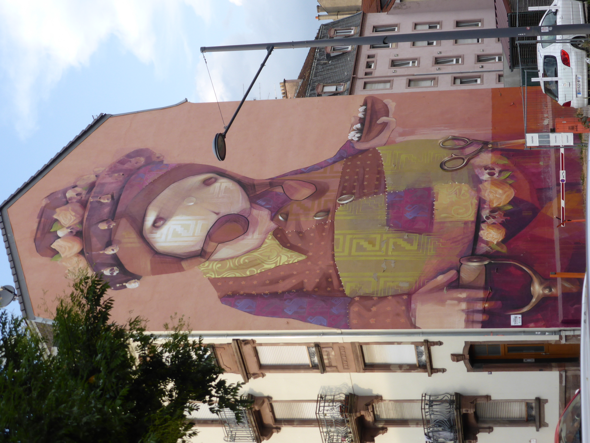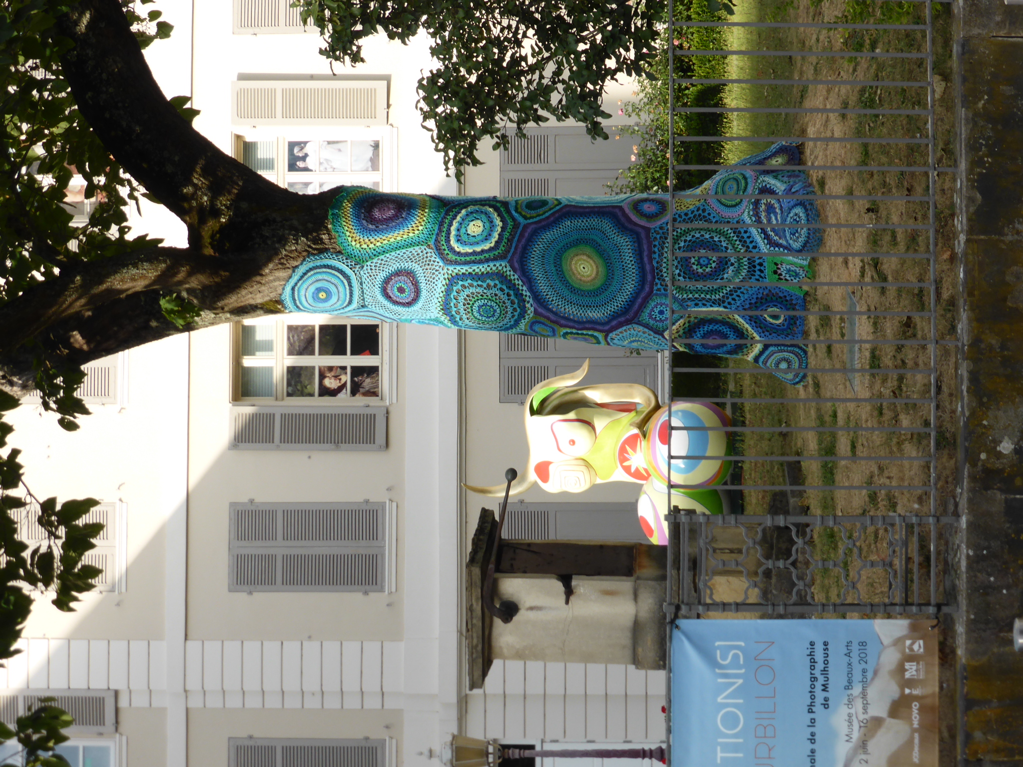 Destination ensuite : Mulhouse, ou ils mettent des pulls aux arbres et ou nous avons fait le tour des murs peints de la ville.